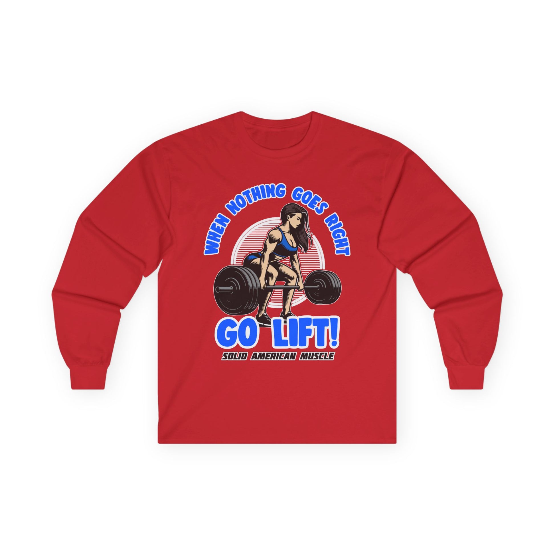 Solid American Muscle - When Nothing Goes Right Go Lift - Woman Lifter - Long Sleeve T-Shirt